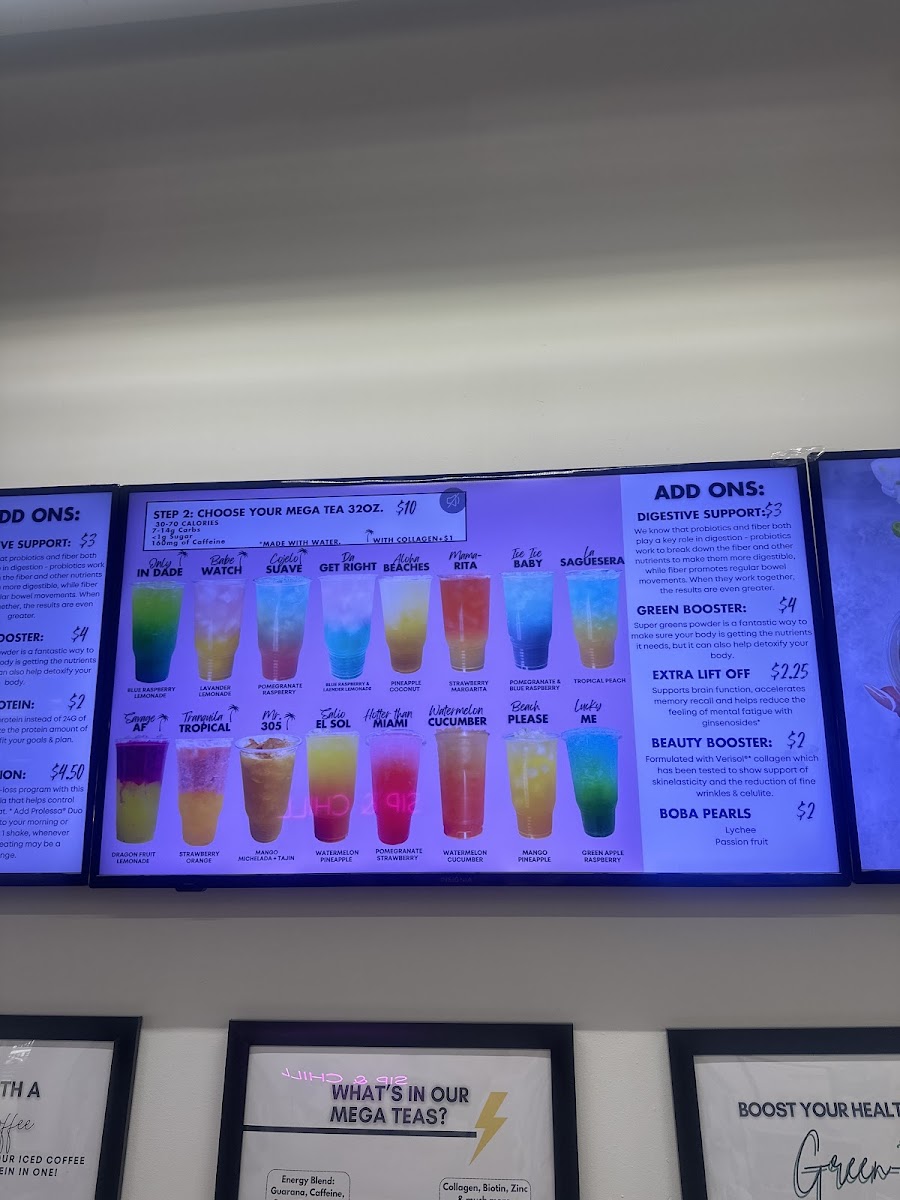 - Mega Teas: Indulge in unique flavors like Aloha Beaches Pineapple Coconut and Babewatch Lavender Lemon Lime, perfect for a revitalizing pick-me-up.